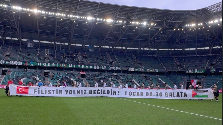 Karşılaşma öncesinde ise anlamlı bir mesaj verildi. Her iki takım futbolcuları, 1 Ocak’ta İstanbul Galata’da yapılacak büyük Filistin mitingine dikkat çekmek amacıyla sahaya pankartla çıktı. Tribünlerden alkış alan pankart, izleyenler tarafından takdirle karşılandı.